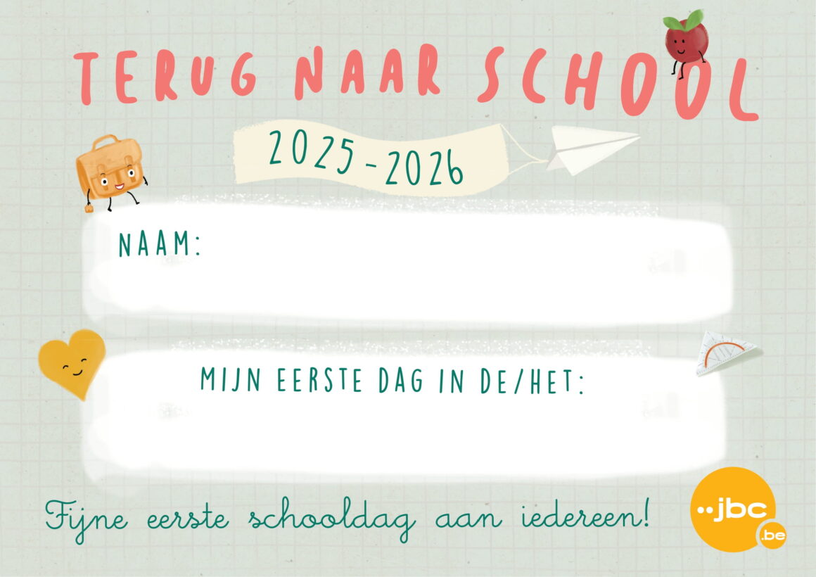 De eerste schooldag is altijd een spannend moment: een nieuwe klas, een nieuwe leerkracht, en heel wat nieuwe avonturen om te beleven. Met dit vrolijke kaartje wensen we jouw mini een topstart toe én je kan er een schooljaar lang JBC-kleding mee winnen!